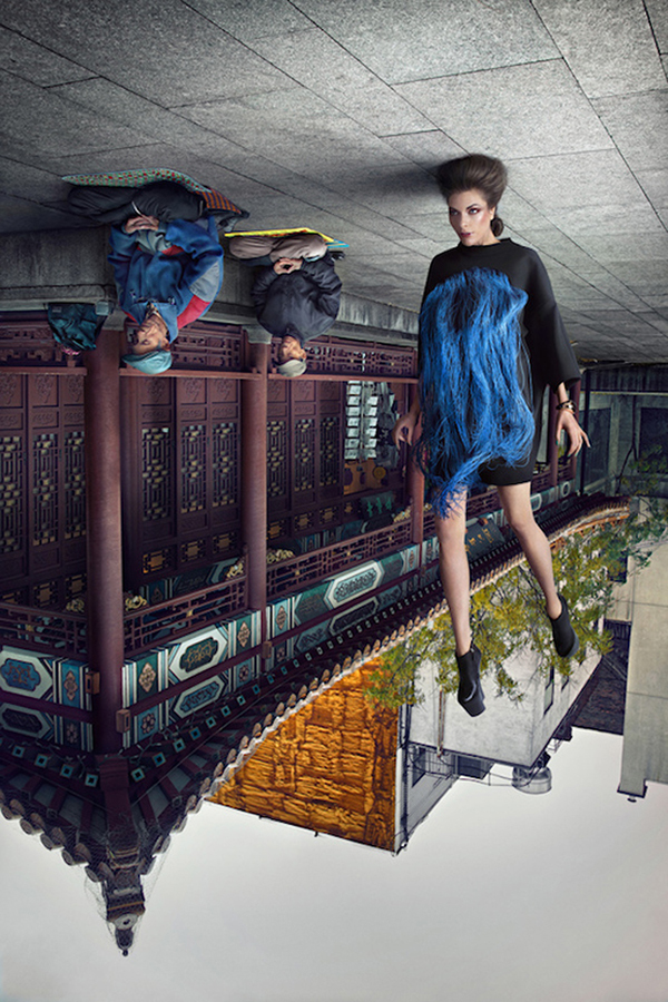 如附圖加拿大攝影師 LePinch 的構想是「顛倒世界」,所以把顛倒的突兀元素加進了攝影作品中,看似平凡的時裝雜誌攝影,卻因為顛倒的背景,讓觀賞者忍不住把目光多停留在照片上,某方面來說也算達到的攝影作品想要達到的效果。