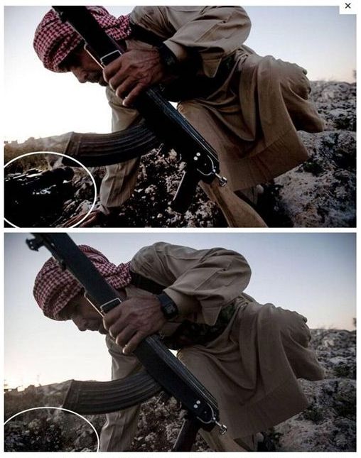 康特拉斯修改了一張2013年在敘利亞拍攝的叛軍照片,以修圖軟體修掉照片左下角的同事錄影機。他認為錄影機會影響讀者觀看照片。(可點選圖片放大)