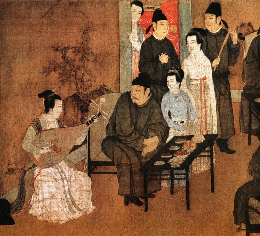第一段寫韓熙載與賓客們聆聽狀元李家明的妹妹「彈奏琵琶」,旁邊還有其他持笛的樂師,暗示了或有管弦合奏的可能,如下圖(來源:Wiki)。