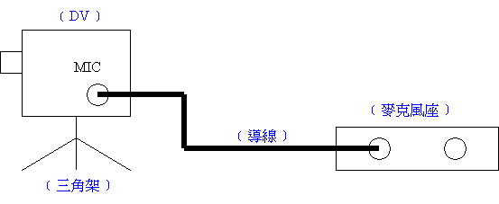 整組器材架設的方式如下圖所示,主要是將 DV機與講台前麥克風座,兩者用導線串接起來,導線最主要的目的是在收音,藉由導線可以將麥克風的聲音直接收到 DV中,而不是用現場收音的方式,這種拍攝方式的好處在於聲音比較清楚,帶子轉出來比較不會有破音或是雜音的情況出現,尤其如果是出外景拍攝,這種收音的方式會比較好‧