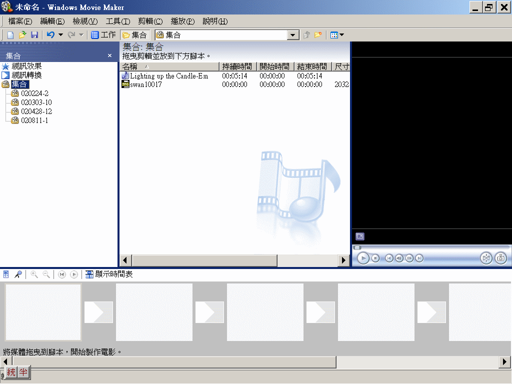 剪接區預設為「顯示腳本」,但這個檢視的工作較不便。故宜按「顯示時間表」,出現時間表檢視,與所有影音軌道。