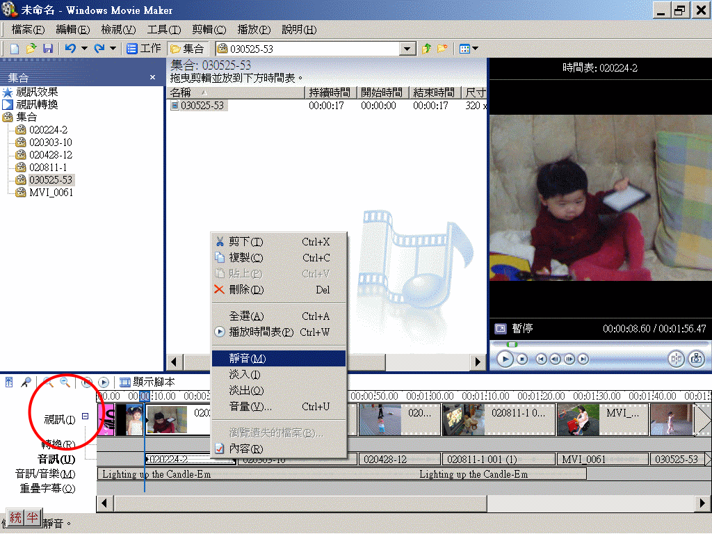 注意:將「視訊」旁之「+」號展開,才會看到DV之音軌。按右鍵可轉為靜音,不過不能刪除。若重新配音,必須貼到獨立音軌上。