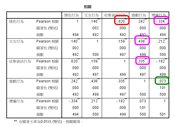 發現除了Game '遊戲行為'與Manner '禮儀行為'之相關未達 .05顯著水準外,亦即無法推翻母群相關為0;其他兩兩相關均達到 .01顯著水準。