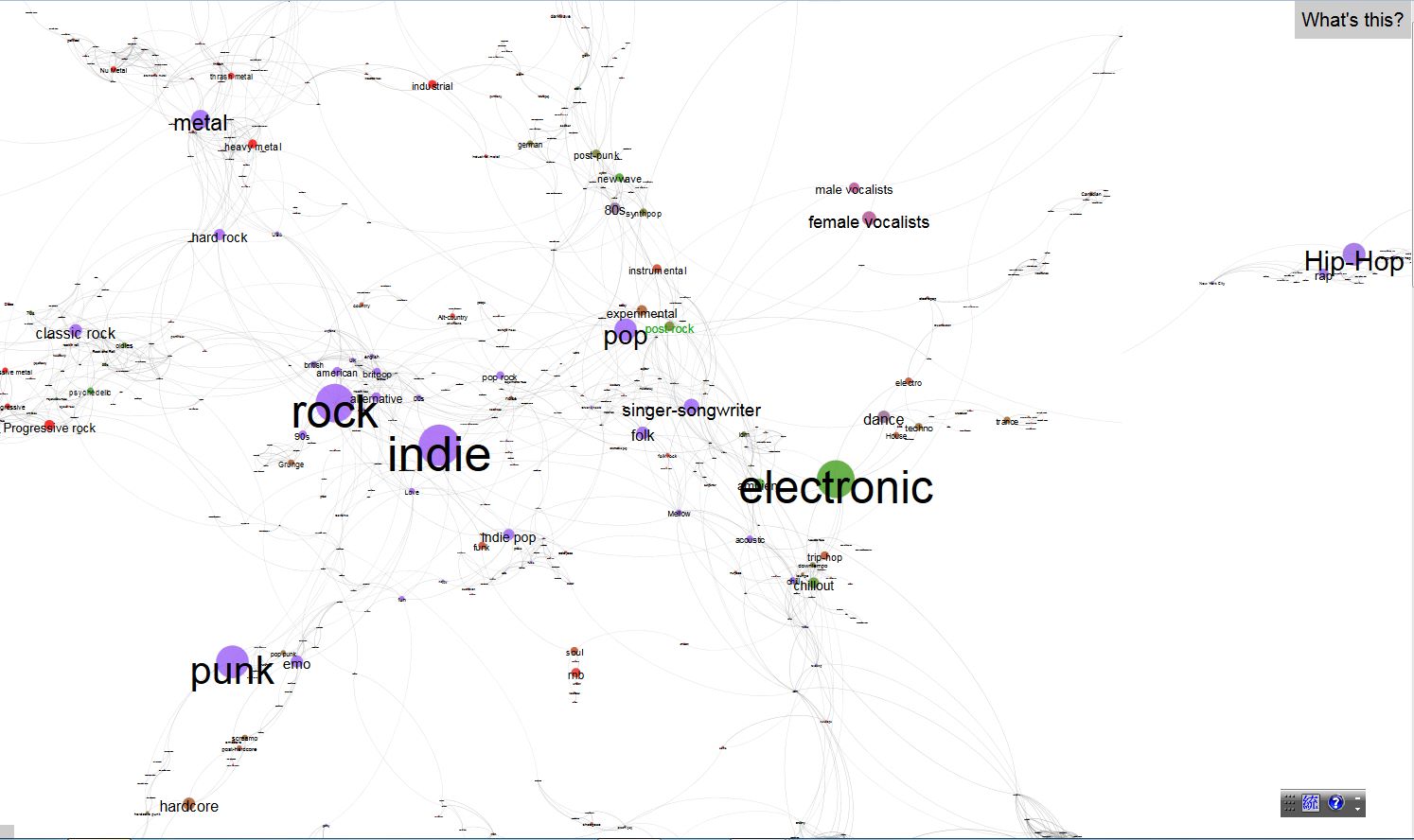 一次聽完總圖包括所有的音樂流派,大致是「古典」在下,而向上發展、最後最上是電音;左邊偏向重節奏,右邊趨向人聲;但因為是多因素的投影,所以並非真正的平面圖。