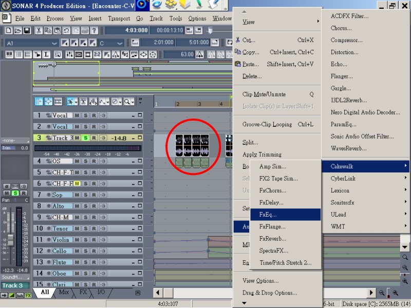 Choose Audio Effects-Cakewalk-FxEq from the Process menu.