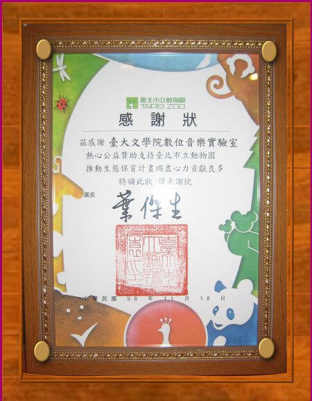 動物園並贈送了臺大數位音樂實驗室和我各一項感謝狀(如頁首圖)。