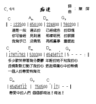 癡迷是一首悲傷的歌詞,作者陳屏卻賦予它一個輕快的節奏,氣氛更顯得突出。這首歌也收入中國創作民歌唱片系列,「我們的歌」第二輯中。